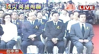 中新網(wǎng)8月19日電 據(jù)臺灣TVBS報道,臺風(fēng)“莫拉克”引發(fā)“八八水災(zāi)”重創(chuàng)臺灣南部,臺灣空勤隊3名英雄張順發(fā)、王宗立和黃鎂智為救人墜機殉職。臺中水湳機場19日舉行告別式,馬英九、“內(nèi)政部長”廖了以、臺中市長胡志強及呂秀蓮都到場致意。