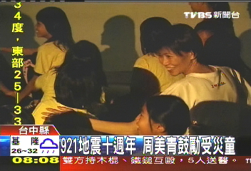 中新網(wǎng)9月8日電 據(jù)臺灣TVBS報道,臺灣921地震十周年,馬英九夫人周美青,7日下午以“周老師”的身份,陪當年的災(zāi)童看紀錄片。