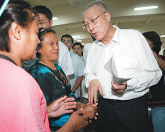 吳敦義帶著“內(nèi)政部”、“經(jīng)建會”等官員,搭乘行政專機(jī)直飛南部災(zāi)區(qū)探視災(zāi)民、災(zāi)區(qū)。他說,“災(zāi)民睡行軍床,我也睡一樣的行軍床”,零距離聽災(zāi)民的抱怨,親自解決災(zāi)民的煩惱。