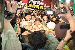 當時馬英九步行,沿路與商家住戶打招呼,拜托支持邱鏡淳,這個時候民進黨提名候選人彭紹瑾,也在謝長廷陪同下從學府路往建新街方向掃街。