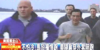 中新網(wǎng)1月27日電 據(jù)臺灣TVBS報道,馬英九“出訪”中美洲過境舊金山的隔天一早,就頂著9度低溫到舊金山海邊慢跑。有趣的是,相較于馬英九短褲、短袖不怕冷的招牌慢跑裝,他身邊的美國隨扈可是個個穿著長袖外套陪跑,深怕感冒。