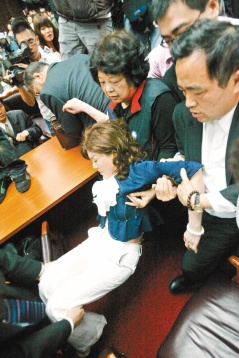 藍(lán)綠陣營(yíng)接下來(lái)爆發(fā)四波激烈肢體沖突,多人掛彩,上午9時(shí)一到,會(huì)議主席趙麗云欲宣布開(kāi)會(huì),當(dāng)場(chǎng)爆發(fā)激烈拉扯、相互動(dòng)手,吳清基在爭(zhēng)吵中完成簡(jiǎn)短報(bào)告,國(guó)民黨團(tuán)提案進(jìn)入大體詢答,此時(shí)又發(fā)生圍著趙麗云的第二波激烈沖突。