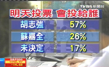 報道稱,誰才是大臺中市民心中理想的第一屆市長?TVBS民調(diào)中心,在5月25日晚間做出的最新民調(diào)顯示,假如明天就是投票日,將有57%的大臺中市民投票給國民黨籍的胡志強,26%投給民進(jìn)黨籍的蘇嘉全,差距有31個百分點,尚未決定的比例則有17%。