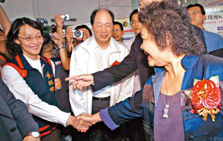 黃昭順、侯彩鳳“立委”先到陪著吳敦義,后來(lái)趕到的陳菊與吳敦義握手后,接著主動(dòng)與黃昭順握手并稱“黃委員”,黃則回以微笑。