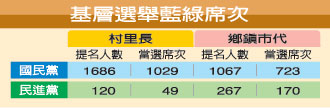 中新網(wǎng)6月13日電 據(jù)臺灣《聯(lián)合報》報道,臺灣17縣市基層選舉結(jié)果12日晚揭曉,國民黨(含以無黨籍參選的黨員)拿下1988席村里長、1187席鄉(xiāng)鎮(zhèn)市民代表,各約占總席次半數(shù),輔選系統(tǒng)評估,藍軍總當選席次明顯高于綠營,藍綠基層版圖變動不大。