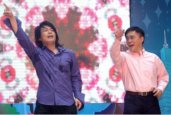 中新網(wǎng)5月19日電 據(jù)“中央社”報道,臺北市將舉辦花卉博覽會,藝人伍佰19日身披紙制環(huán)!疤諔(zhàn)警裝”化身“i花博”環(huán)保親善大使,與臺北市長郝龍斌大跳招牌花朵舞。伍佰高唱“你是我的花博”,強(qiáng)調(diào)愛地球、做環(huán)保,要“不眠也不休”。