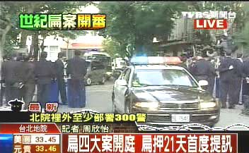 車隊不到15分鐘即抵達臺北地院,鐵門隨即降下,不讓陳水扁的模樣曝光,據(jù)指出,陳水扁今天沒有抹發(fā)油,頂著一頭翹發(fā)、戴著手銬出庭。他的兩位委任律師鄭文龍和石宜琳,之前預(yù)告要在庭上做出激烈手段,因此警方不敢大意,部署霹靂小組在法庭內(nèi)戒備。