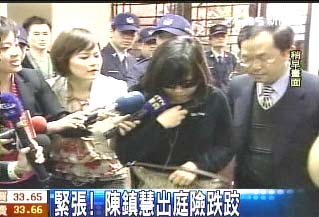 上午9點(diǎn)15分,在律師林達(dá)杰的陪同下,陳鎮(zhèn)慧一身黑衣、戴著大墨鏡走進(jìn)法院,不知是太緊張還是大墨鏡影響,陳鎮(zhèn)慧差點(diǎn)跌了一跤。根據(jù)觀察,陳鎮(zhèn)慧在要進(jìn)入第七法庭前,身體微微瑟縮,律師拍拍她肩膀安撫她,才終于踏進(jìn)法庭。