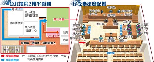 合議庭考慮吳淑珍身體狀況,預(yù)計(jì)這兩天各開庭4小時(shí)。法院也開放第八法庭給臺(tái)大醫(yī)院放置臨時(shí)病床、心電觀察儀器和呼吸器材,兩名醫(yī)師、兩名護(hù)士也可在此休息,法院外也將有救護(hù)車待命。由于臺(tái)大仍認(rèn)為吳淑珍不適合長時(shí)間坐著,合議庭今將每30分鐘讓她休息一下,由醫(yī)護(hù)量心跳及血壓,她若有需要,可在被告席桌下擺一臺(tái)電暖器保暖。