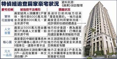 特偵組為追查扁家是否利用購買豪宅洗錢,除調(diào)查寶徠及脫手的一品苑外,還鎖定追查扁家的高雄人文首璽2戶豪宅,以及扁家是否委任“中鋼”前董事長林文淵低價(jià)代購北市“植心園”2戶豪宅。