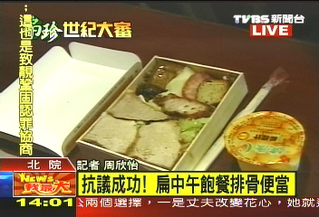 不過抱怨還是有效的,中午陳水扁的午餐已換成價值70元的排骨便當。臺北地方法院經(jīng)過開會決定,只要是整天庭訊的人,臺北法院中午就會準備一個便當,若是連續(xù)兩天開庭的話,晚餐也會準備便當供出庭的人食用。