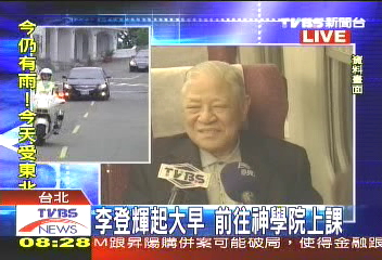 中新網(wǎng)4月7日電 李登輝重拾書本?據(jù)臺灣TVBS報道,他每周到臺灣神學(xué)院選修“宗教改革神學(xué)”相關(guān)課程,7日上午8點不到就已經(jīng)抵達神學(xué)院,隨扈車隊相當?shù)驼{(diào)直接開進神學(xué)院,預(yù)計今天要上的是“改革宗學(xué)院傳統(tǒng)”這門課程。