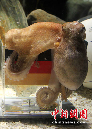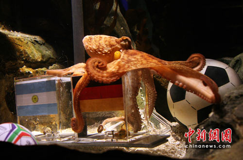 據(jù)悉,海洋館員把分別印有德、阿旗幟的貝殼放入玻璃缸,與對英格蘭隊(duì)比賽前脆快取出德國那枚貝殼不同,章魚“保羅”對德國和阿根廷的對決有些“猶豫不決”,“考慮了長達(dá)一小時(shí)”但是最終還是取出了印有德國旗幟玻璃缸里的貝殼。