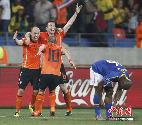 中新網(wǎng)7月2日電 今晚22:00,南非世界杯進(jìn)行了1/4決賽的首場比賽,由荷蘭隊在伊麗莎白港的曼德拉灣球場迎戰(zhàn)巴西。雖然羅比尼奧在上半場率先破門,但下半場憑借梅洛的烏龍球和斯內(nèi)德頭槌建功,荷蘭隊2-1逆轉(zhuǎn)擊敗巴西隊,率先挺進(jìn)四強(qiáng)。
