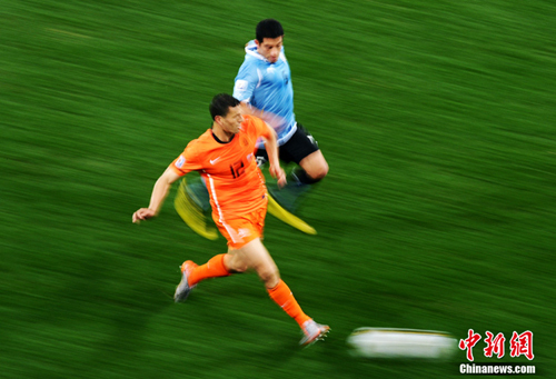 中新網(wǎng)7月7日電 今天凌晨2:30,南非世界杯半決賽首場較量在開普敦綠點球場拉開戰(zhàn)幕,由南美老牌勁旅烏拉圭迎戰(zhàn)荷蘭隊。布隆克霍斯特遠(yuǎn)射先拔頭籌,而弗蘭也通過一記遠(yuǎn)射將比分扳平。下半場斯內(nèi)德和羅本連續(xù)進(jìn)球一度令荷蘭隊鎖定勝局,然而補(bǔ)時階段烏拉圭人的進(jìn)球似乎又燃起了最后的希望,但荷蘭隊頂住了對手的瘋狂進(jìn)攻,3-2擊敗烏拉圭隊,成功挺進(jìn)決賽。