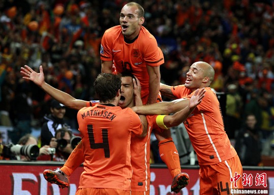 中新社北京7月7日電 在今天凌晨進(jìn)行的一場南非世界杯半決賽中,荷蘭隊3比2險勝烏拉圭,率先晉級決賽。荷蘭球員斯內(nèi)德攻入一球,幫助自己的球隊再度領(lǐng)先,他被評為本屆比賽的最佳球員。其在本屆世界杯上的進(jìn)球數(shù)已增至5個,與西班牙球員比利亞并列領(lǐng)先射手榜。