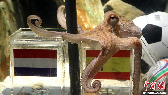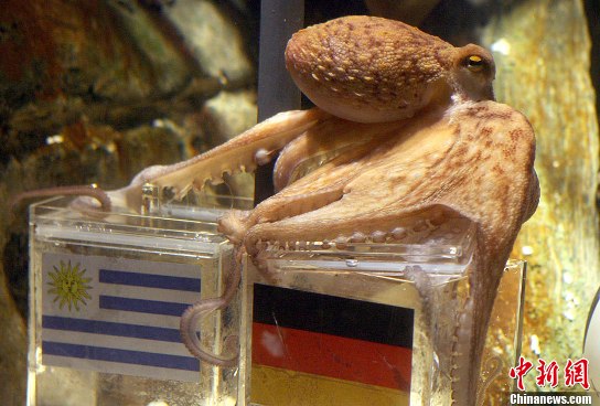 章魚“保羅”絕對是本屆世界杯賽的大明星,對德國隊的比賽的競猜他已經(jīng)是屢試不爽。除了兩年前尚處在幼年的它對歐洲杯預(yù)測6中其5,猜錯了決賽外,其他的比賽,包括本屆世界杯賽,它猜中了13場比賽中的12場!