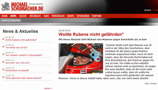 舒馬赫在官網(wǎng)上稱:“再次看過(guò)我與魯本斯之間的錄像后,我覺(jué)得干事的處罰是正確的。那種強(qiáng)硬的防守確實(shí)太過(guò)分了。我沒(méi)有發(fā)覺(jué)我的動(dòng)作帶給他的危險(xiǎn)。如果他這么覺(jué)得,那么我要說(shuō):對(duì)不起,我不是故意的。”