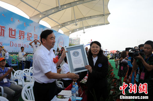 中新網(wǎng)鄂爾多斯8月12日電(記者 盧巖)一項(xiàng)沉寂十年之久的吉尼斯世界紀(jì)錄今天在鄂爾多斯被打破。作為首屆鄂爾多斯國(guó)際那達(dá)慕大會(huì)重要活動(dòng)之一的“萬(wàn)人多米諾”項(xiàng)目暨吉尼斯世界紀(jì)錄挑戰(zhàn)活動(dòng)在東勝圓滿落幕,刷新了由新加坡在2000年創(chuàng)造的9234人的紀(jì)錄。
