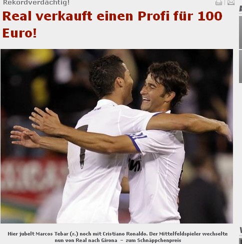 繼去年收購C羅花掉9400萬歐元創(chuàng)下世界足球歷史最高轉(zhuǎn)會費(fèi)紀(jì)錄之后,皇馬有望再次創(chuàng)造歷史。預(yù)備隊(duì)、現(xiàn)丙級聯(lián)賽球隊(duì)皇馬卡斯蒂亞隊(duì)球員馬克斯-特巴爾將以100歐元的價格被賣到西乙球隊(duì)赫羅納,圖片報稱,100歐元的轉(zhuǎn)會費(fèi)有可能成為世界職業(yè)足壇歷史最低身價。