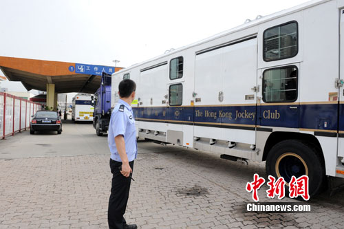 10日清早7時(shí)40分,香港賽馬會(huì)的兩輛粵港兩地牌貨車(車內(nèi)運(yùn)有18匹賽馬)和6輛隨行保障車由香港經(jīng)皇崗口岸入境,皇崗邊檢站警戒隊(duì)按預(yù)案要求,派警車從橋頭將運(yùn)馬車輛一行安全引帶至貨檢入境查驗(yàn)場(chǎng)地?吭谥付ǖ呐R時(shí)候檢區(qū)域,并擔(dān)負(fù)警戒監(jiān)護(hù)工作。在檢驗(yàn)檢疫部門進(jìn)行消毒的同時(shí),貨車檢查隊(duì)、小(客)車檢查隊(duì)的民警立即聯(lián)動(dòng),高效、快捷、優(yōu)質(zhì)的為入境機(jī)動(dòng)車司機(jī)、馬童及隨行人員共33人的證件辦理查驗(yàn)手續(xù)。8時(shí)50分,運(yùn)馬車輛及隨行人員離開皇崗口岸前往廣州亞運(yùn)馬術(shù)場(chǎng)。