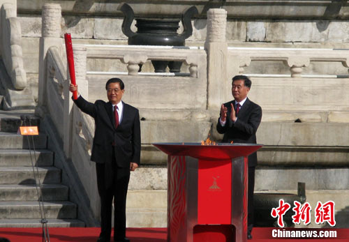 隨后,廣東省委書記汪洋從火種衛(wèi)士手中接過引火棒,點燃祈年殿前的火種盆。中共中央總書記、國家主席胡錦濤在火種盆中點燃了火炬,亞運北京首棒火炬手張琳從胡錦濤手中接過了火炬“潮流”。