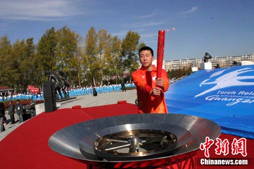 火炬最后傳到長春市公安消防支隊(duì)凈月大隊(duì)消防員孟繁金手中,由他在長春雕塑公園主雕塑前點(diǎn)燃圣火盆;鹁?zhèn)鬟f現(xiàn)場還舉行了一系列群眾性全民健身展示活動(dòng),來為廣州亞運(yùn)會(huì)加油助威。