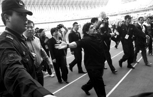 終場(chǎng)前5分鐘,主席臺(tái)上的馬拉多納終于起身,現(xiàn)場(chǎng)主持人興奮得馬上宣布,“馬拉多納因?yàn)橛型葌,特地半小時(shí)前打了封閉,現(xiàn)在可以下場(chǎng)踢球了!币粫r(shí)間,全場(chǎng)又是一陣歡呼聲。不過(guò),此時(shí)全場(chǎng)最搞笑的一幕出現(xiàn)了,腳穿皮鞋的馬拉多納在贊助商陪同下走到場(chǎng)邊,然后,對(duì)著場(chǎng)內(nèi)大呼小叫了一番,前后不過(guò)三四分鐘時(shí)間,主裁就吹響全場(chǎng)結(jié)束哨聲?磁_(tái)上,至少花200元錢(qián)買(mǎi)票入場(chǎng)的球迷這才發(fā)覺(jué)上當(dāng),終于爆發(fā)出陣陣吼聲:“騙子,退票!退票!”此時(shí),老馬頭也不抬,一溜煙跑回了休息室。記者 徐東海