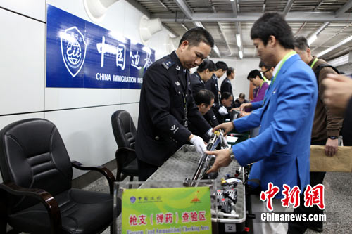 中新網(wǎng)廣州11月9日電 (唐貴江 張瑞)記者今日從廣州白云出入境邊防檢查站獲悉, 11月8日該口岸迎來第一次槍彈入境高峰,印度、越南、韓國等10個國家的射擊比賽運(yùn)動員攜帶各類比賽用槍和比賽用子彈入境。