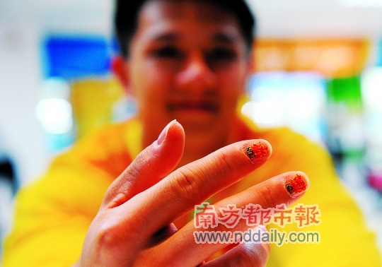 在陳琳將陳一冰指甲上的國(guó)旗和“冰”字稍作修補(bǔ)后,“他對(duì)我說(shuō),能不能再給我設(shè)計(jì)一個(gè)娜字,和這個(gè)冰一樣,涂在右手中指指甲上,說(shuō)的時(shí)候還有點(diǎn)靦腆,但我一下子就明白了,就照這在他的指甲上圖上了一個(gè)大紅的‘娜’字!标惲照f(shuō)。