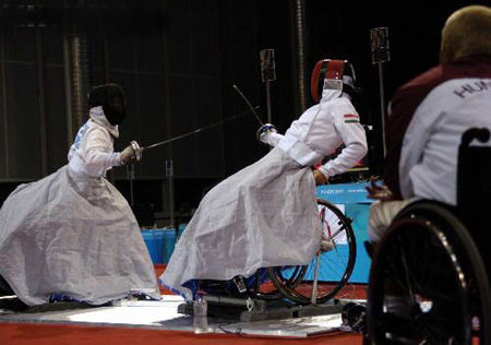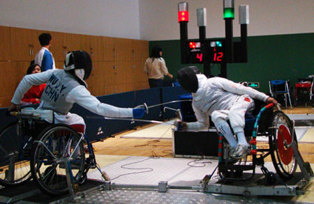 輪椅擊劍運動是根據(jù)下肢殘疾運動員(包括截肢, 脊髓灰質(zhì)炎, 腦癱和截癱)的特點而專門設(shè)計的一項運動。對于觀眾來說,輪椅擊劍運動最讓他們感到與眾不同的,就是比賽雙方運動員的輪椅都固定在可調(diào)節(jié)軌道的框架上進(jìn)行比賽。然而,盡管坐在這樣的輪椅上,運動員只能自由移動他們身體的上半部分,但他們出劍的速度并不比健全運動員慢,甚至要更快。