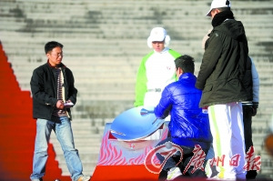 昨天的北京一掃前日的大霧氣,天高云淡,寒風(fēng)凜冽。在世紀(jì)壇靠近頂端的臺(tái)階上,搭建了一個(gè)紅色的采火臺(tái)。17名少女身著白色的羽絨衣,列隊(duì)演練,不斷熟練地跟隨采火使者緩緩步下臺(tái)階的節(jié)奏和路線。看起來,她們中不止一人來自新疆。但只有一名長發(fā)女子一直在周嘉威周圍,反復(fù)演練采火的動(dòng)作與行進(jìn)的路線。
