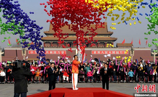 中新網(wǎng)北京12月4日電 2010年廣州亞洲殘疾人運(yùn)動(dòng)會(huì)火炬點(diǎn)燃暨火炬?zhèn)鬟f活動(dòng)啟動(dòng)儀式,今日上午在北京人民大會(huì)堂北大廳舉行。中共中央政治局常委、國(guó)家副主席習(xí)近平在啟動(dòng)儀式上點(diǎn)燃主火炬,并宣布火炬?zhèn)鬟f活動(dòng)開(kāi)始。