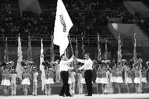 下一站,天津 閉幕式上,國(guó)家體育總局局長(zhǎng)劉鵬(右)將中華人民共和國(guó)運(yùn)動(dòng)會(huì)會(huì)旗交給天津市市長(zhǎng)黃興國(guó)。第十三屆全運(yùn)會(huì)將于2017年在天津舉行。新華社發(fā)