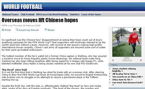 國(guó)際足聯(lián)官方網(wǎng)站昨天以《海外球員重燃中國(guó)足球希望》為題,對(duì)中國(guó)足壇新一代“留洋潮”進(jìn)行了報(bào)道。文章稱(chēng),自國(guó)足無(wú)緣南非世界杯之后,中國(guó)球迷們承受了巨大的失望。他們自嘲是“世界上最好的球迷”,但沒(méi)有匹配的球隊(duì)。然而,隨著幾名球員最近再度走出國(guó)門(mén),中國(guó)球迷們的熱情再度被調(diào)動(dòng)。