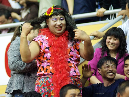 “如花”顯然是有備而來,他戴著花圍巾、穿著花衣裳,賽前先是戴著一個黑色的發(fā)套現身。比賽中他還到洗手間重新打扮,換上紅藍相間的發(fā)套再回到賽場。據當地媒體記者介紹,這個球迷是江蘇舜天隊的鐵桿球迷,大家都稱他“胖哥”。在足球場上,這個球迷也是如此打扮為江蘇舜天隊加油,看到舜天本周沒有比賽,他就到籃球賽場上來“湊熱鬧”了。(記者潘天舒)