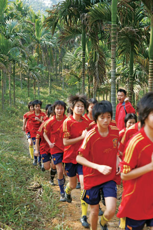 瓊中女足的訓(xùn)練場坐落在縣中學(xué)里,操場四周包裹著高大的檳榔樹和橡膠樹,在霧氣中顯得十分幽靜!鞍亚騻鞒鋈,怎么那么猶豫呢!”一個沙啞的聲音打破了沉靜。