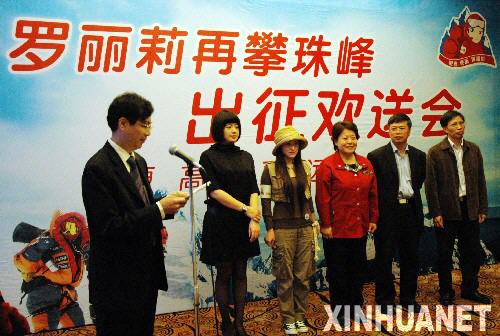 3月26日,羅麗莉(左三)在出征儀式上。當(dāng)日,27歲的廣西女孩羅麗莉第二次登珠峰出征歡送會(huì)在廣西南寧舉行。羅麗莉從2002年到2007年,五次攀登了三座8000米以上的山峰,還曾創(chuàng)造了兩年連登三大高峰的奇跡。2006年羅麗莉曾嘗試登頂珠峰,但由于氧氣面罩漏氣等原因在登到海拔86