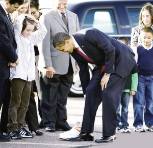 眼見奧巴馬下了飛機(jī)后,看到地上這只球鞋,還特別彎下腰,笑著拿自己皮鞋與奧胖這只大鞋比試一下,果然奧巴馬尺寸“小巫見大巫”,全場(chǎng)接機(jī)人員都笑成一團(tuán)。據(jù)悉,這只球鞋為橘色與白色相間,上面有著奧尼爾個(gè)人簽名。 ○張喆