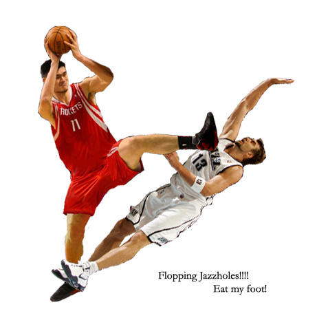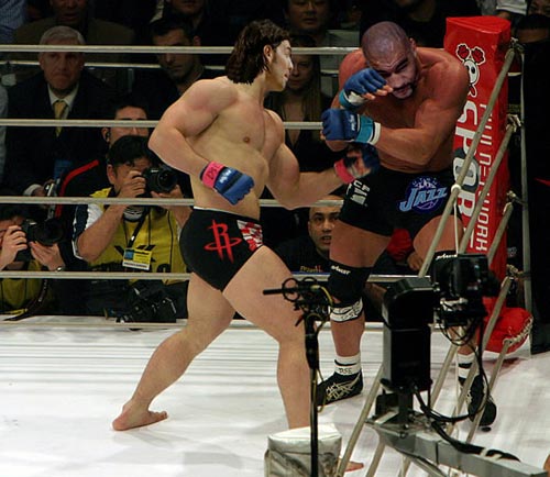 白人拳手斯科拉身著一條印有火箭隊徽的黑色拳擊短褲,在拳擊臺上勇猛無比,他正以一記左勾拳刺向布澤爾,而且雖然只是一個側(cè)面,但隱約可見斯科拉神情專注,殺氣騰騰,一副志在一拳將其KO倒地的氣勢。而肌肉比斯科拉更發(fā)達的布澤爾,則一副饒命相,他蜷縮在拳臺的角落,左手試圖擋住斯科拉刺出的重拳,右手則十分猥瑣地護住自己的眼睛,似乎只有招架之功,而毫無還手之力。不過這張PS圖片也有漏洞,一則是拳擊場上運動員穿的應(yīng)該不是緊身短褲,二是兩人的短褲的顏色不應(yīng)該都是黑色。不過總的來說,這張圖片PS得非常成功,布澤爾短褲上的爵士隊標清晰可見,而且兩人的神態(tài)也是惟妙惟肖,直接反應(yīng)出了斯科拉的強勢和布澤爾的不堪一擊。