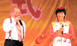 何賽飛的話顯然啟發(fā)了楊秀麗,在記者的“慫恿”下,她向協(xié)辦此次畫展的中體明星隊領隊王奇說了自己的想法。王奇立即將楊秀麗送上了臺并和主持活動的崔永元偷偷交代!岸祭蠋煟埩舨!贝抻涝獙l(fā)言完畢的都本基留在臺上,“奧運冠軍楊秀麗希望能拜您為師學習書法!边@是個意外安排,都本基大師顯得非常激動!斑@個徒弟我收下了!”老人的干脆讓楊秀麗有些驚訝,她深深地向老師鞠了一躬,頭上的汗水晶瑩可見!拔业膵屟,緊張死了,從沒這么緊張過!苯K于如愿的楊秀麗抹了一把汗說,“這下我回去更要好好練字了!