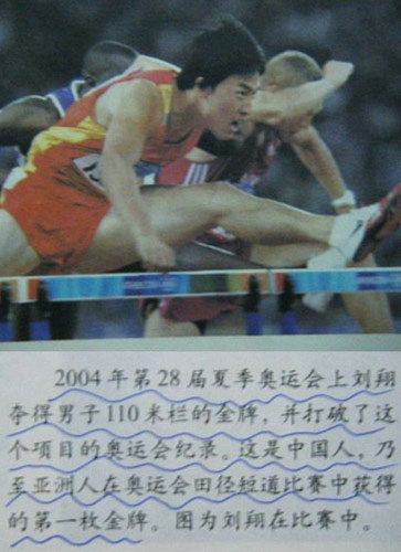 在圖片下附著的文字說明這般寫道:“2004年第28屆夏季奧運(yùn)會上劉翔奪得男子110欄的金牌,并打破了這個(gè)項(xiàng)目的奧運(yùn)會紀(jì)錄。這是中國人乃至亞洲人在奧運(yùn)會田徑短道比賽中獲得的第一枚金牌。圖為劉翔在比賽中!