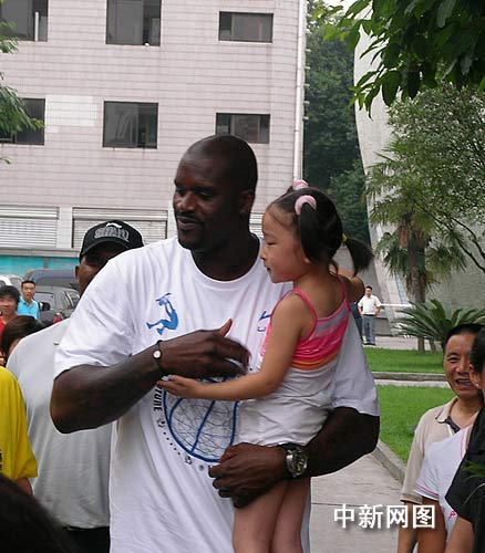 奧尼爾一下車,就受到孩子們的擁戴,現(xiàn)場一片歡呼聲和歡迎聲。已經(jīng)有了三個孩子的奧尼爾,興奮地抱起給他獻花的一位七歲小女孩,親了親她的臉頰。在人們的簇擁下,奧尼爾參觀了汶川地震發(fā)生后修建的板房以及新校舍,詳細了解災(zāi)后孩子們的學習生活狀況。