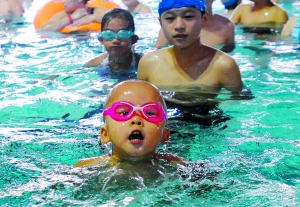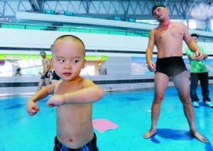 接下來(lái),小家伙就要表演20米蛙泳了!把拢蚯败S——”劉先生的口令剛喊出口,小劉暢胖嘟嘟的小腿一蹬地,已經(jīng)撲通一聲跳進(jìn)水池。很快,他的身體就浮出了水面,滿不在乎地向前游去,可愛的模樣立刻引來(lái)一陣掌聲。