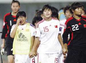 下半場(chǎng)開始后朝鮮隊(duì)獲角球機(jī)會(huì),15號(hào)崔云珠開出后,9號(hào)尹賢姬頭球攻門,皮球高出橫梁。第65分鐘朝鮮獲得角球機(jī)會(huì),朝鮮隊(duì)角球開出后中國(guó)隊(duì)的后衛(wèi)起跳速度比對(duì)方慢了半拍,7號(hào)許云星高高跳起,皮球打在中國(guó)隊(duì)大門的右邊邊網(wǎng)上破門得分。朝鮮隊(duì)1:0領(lǐng)先。此后中國(guó)女青全面出擊,但收效甚微。最終中國(guó)隊(duì)以0:1負(fù)于朝鮮隊(duì)獲得第四名,無(wú)緣明年的世青賽。中國(guó)女青曾在世青賽上,0:5不敵朝鮮女青,此次輸球也在意料之中。但女足姑娘們比賽結(jié)束后還是抱頭痛哭,難掩心中的失望之情。