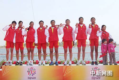 在家門口參賽的山東隊(duì)日照籍舵手徐淼受到很大的關(guān)注。她年僅3歲的雙胞胎女兒也來(lái)到現(xiàn)場(chǎng)為自己的媽媽加油,兩個(gè)小家伙一出現(xiàn)就成為媒體關(guān)注的焦點(diǎn)。比賽結(jié)束后,在眾人的鼓勵(lì)下徐淼領(lǐng)著一雙小兒女與8名隊(duì)友一起登上了領(lǐng)獎(jiǎng)臺(tái),母女同享奪金牌的快樂(lè)。