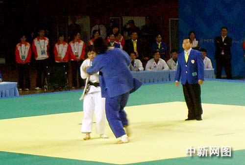 江蘇老將劉歡緣戰(zhàn)績顯赫,曾在2004年全國錦標(biāo)賽女子無差別級金牌;2003年亞錦賽女子無差別級金牌。其身高1.95米,身體素質(zhì)好。山東姑娘劉霞的身高為1.80米,與人高馬大的劉歡緣相比略顯矮小。因此,在上場之初劉霞就采取了步步為營的堅守戰(zhàn)略,抵御著劉歡緣猛烈的進(jìn)攻。雙方都在尋找對手的弱點,因此一時僵持不下。在為時5分鐘的比賽時間結(jié)束后,雙方進(jìn)入金分加時賽。在金分加時賽中,劉霞憑著頑強(qiáng)的意志與不懈努力,化解了身體素質(zhì)明顯強(qiáng)于自己的劉歡緣的所有攻勢,保證城池不失至最后一刻。