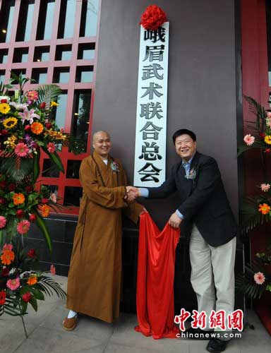 中新網(wǎng)成都5月13日電(林立)13日下午,峨眉武術(shù)聯(lián)合總會掛牌暨峨眉武術(shù)養(yǎng)生健身館開館儀式在峨眉山大佛禪院內(nèi)隆重舉行。國家體育總局武術(shù)運動管理中心黨委書記、中國武術(shù)協(xié)會副主席何青龍,中國佛教協(xié)會副會長、峨眉山佛教協(xié)會會長、峨眉武術(shù)聯(lián)合總會名譽會長釋永壽為峨眉武術(shù)聯(lián)合總會及峨眉武術(shù)養(yǎng)生健身館揭牌剪彩。李連杰恩師吳彬等武術(shù)名家受聘為名譽顧問。
