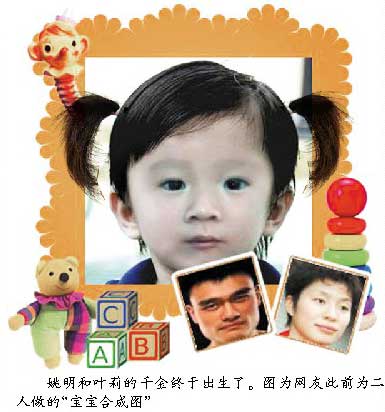 北京時間今天早晨,姚之隊給本報記者發(fā)來報喜短信,姚明與葉莉的女兒在美國休斯敦一家醫(yī)院誕生,目前母女平安。