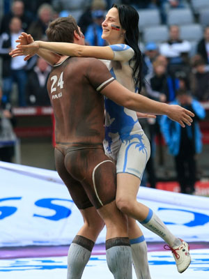德乙聯(lián)賽第22輪,慕尼黑1860在主場(chǎng)以5:1大勝圣保利。 終場(chǎng)前從主客兩隊(duì)的看臺(tái)上分別躍下一個(gè)身穿1860隊(duì)服的姑娘和一個(gè)身穿圣保利隊(duì)服的小伙,兩人一路狂奔來到球場(chǎng)中圈,旁若無人的熱吻起來。仔細(xì)觀察才能發(fā)現(xiàn)他們所穿的“隊(duì)服”的奧秘----這對(duì)情侶都只穿了一條內(nèi)褲,他們身上的衣衫完全是足以亂真的人體彩繪,F(xiàn)場(chǎng)保安也為這浪漫一幕所感動(dòng),他們面帶微笑將這對(duì)情侶請(qǐng)出草坪。(圖片來源:1860隊(duì)官方網(wǎng)站)